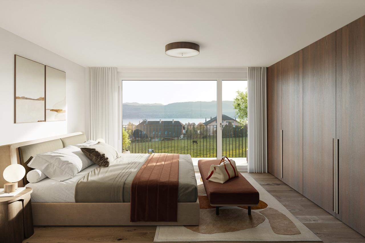 Das Raumprogramm ist klar strukturiert und die Anordnung der einzelnen, gut proportionierten Räume in Kombination mit dem hochwertigen Ausbau sind überzeugend. Der offene Wohn-/Essbereich mit Küche lässt durch seine Grosszügigkeit eine optimale Möblierung zu. Die grossflächigen, raumhohen Fenster verbinden Innen mit Aussen und gewähren zu jeder Tages- und Jahreszeit schöne Aus- und Weitblicke.